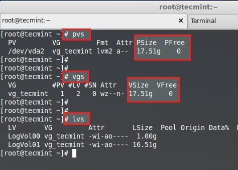 pvdisplayorvgdisplayshows the extra free PE (Physical Extents).
